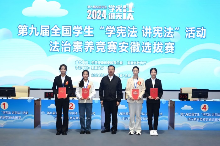 10月14日,安徽省教育厅公布全省第九届学生“学宪法 讲宪法”比赛获奖名单,我校由法学院张雅琪、张梓彤、吴鹏、陈皓萱四名同学组成的代表队共收获奖项4个。其中,张雅琪在法治素养竞赛(大学组)中获一等奖第一名,将代表安徽省参加全国“学宪法 讲宪法”总决赛。