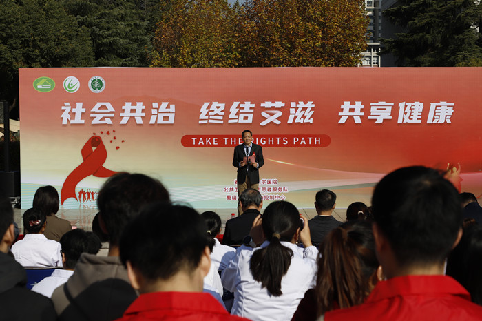 校本部线下活动在校园文化广场进行,公共卫生学院党委书记马军成在致辞中表示,人人都要知“艾”防“艾”,积极参与到抗艾行动中来,杜绝歧视。他希望师生共同担起防艾责任,昂首迈向2030年终结艾滋病公共卫生威胁的目标。校医院职工倾情献唱《天空有雨,伞下有你》,用歌声倡导反对歧视,为艾滋病感染者营造理解、宽容的社会氛围。