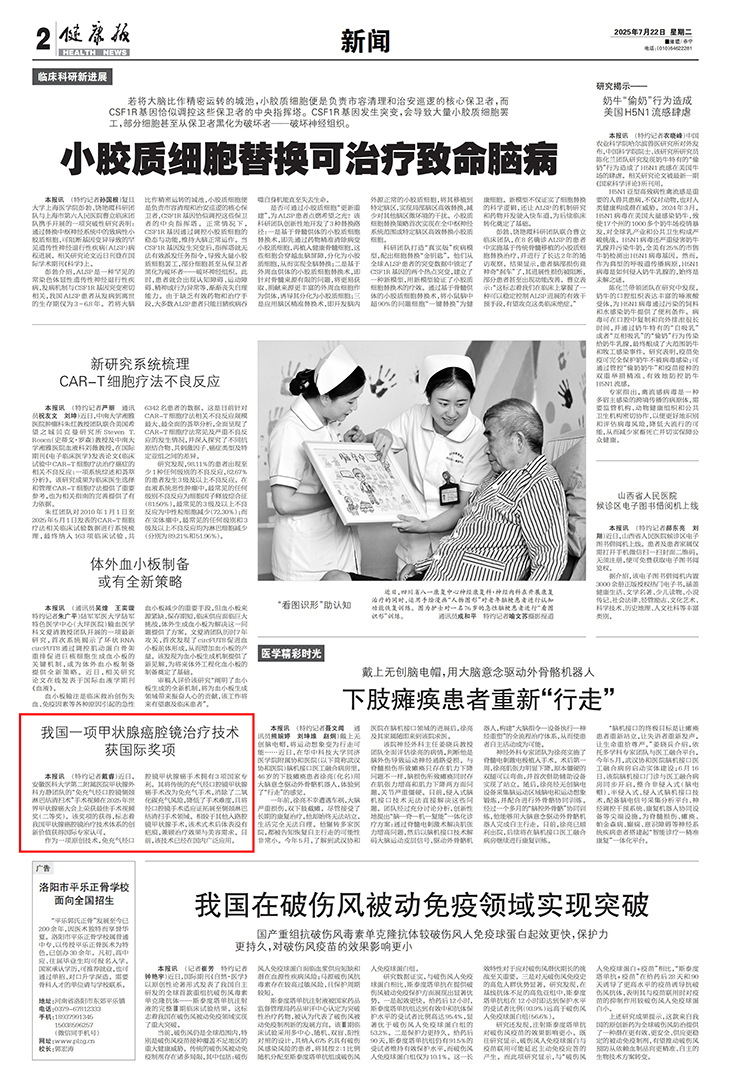 健康报:我国一项甲状腺癌腔镜治疗技术获国际奖项